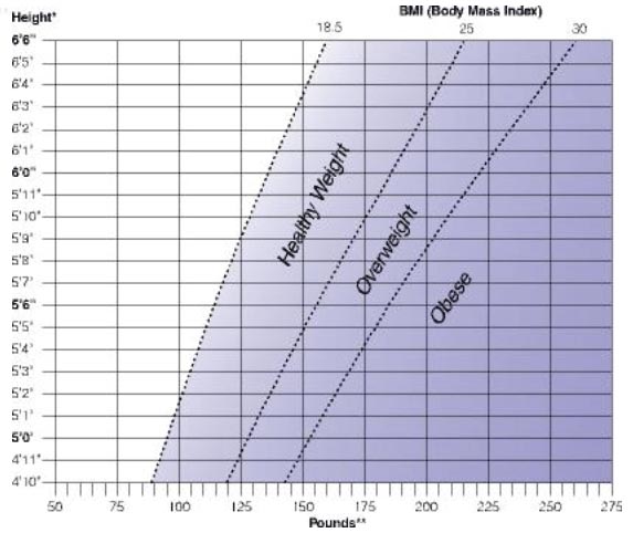 Want to know what obesity and the body mass index? We asked the National Institutes of Health for answers to basic questions. We know: All About ObesityWhat does obesity mean?Health professionals define "overweight" as an excess amount of body weight that includes muscle, bone, fat, and water. "Obesity" specifically refers to an excess amount of body fat. What amount of body fat is defined as obese?Most health care providers agree that men with more than 25 percent body fat and women with more than 30 percent body fat are obese. In recent years, body mass index (BMI) has become the medical standard used to measure overweight and obesity. What is the body mass index?BMI uses a mathematical formula based on a person's height and weight. BMI equals weight in kilograms divided by height in meters squared (BMI = kg/m2). The BMI table that follows has already calculated this information in inches and pounds. A BMI of 25 to 29.9 indicates a person is overweight. A person with a BMI of 30 or higher is considered obese. Find your weight on the bottom of the graph. Go straight up from that point until you come to the line that matches your height. Then look to find your weight group. ![]() What causes obesity?Obesity occurs when we consume more calories than we burn. What causes this imbalance between calories in and calories out may differ from one person to another. Factors that contribute to obesity are: